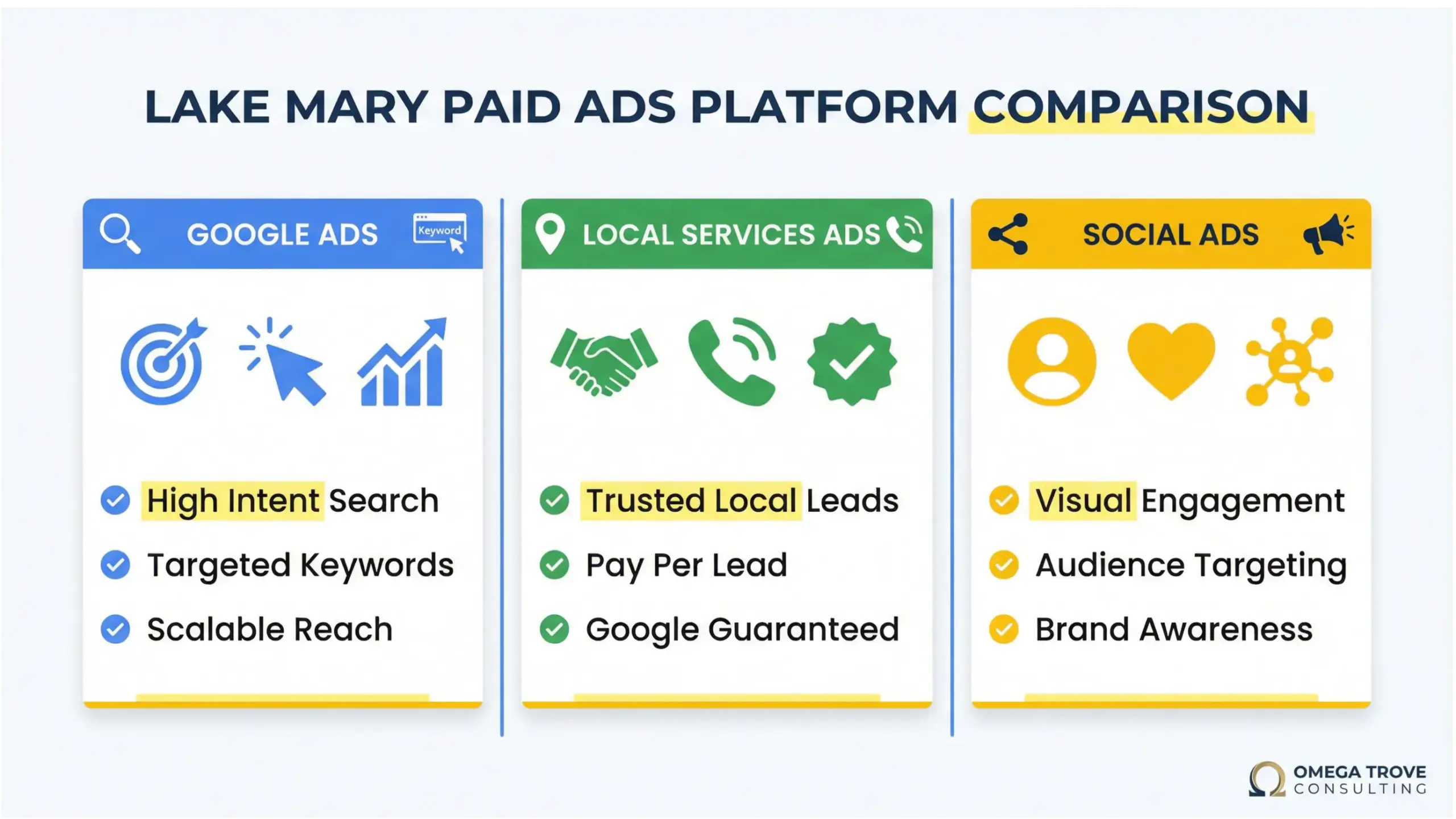The most effective Lake Mary paid ads typically include Google Search Ads, Google Local Services Ads, and Meta (Facebook & Instagram) Ads, each serving a different role in the customer journey.