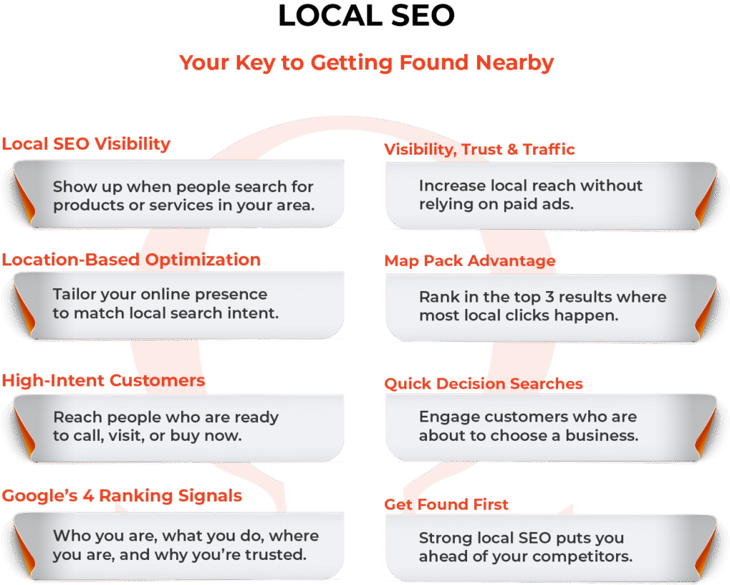 Local SEO improves visibility, builds trust, and drives traffic without ongoing ad spend. It’s a long-term, cost-effective way to consistently attract customers in your area.
